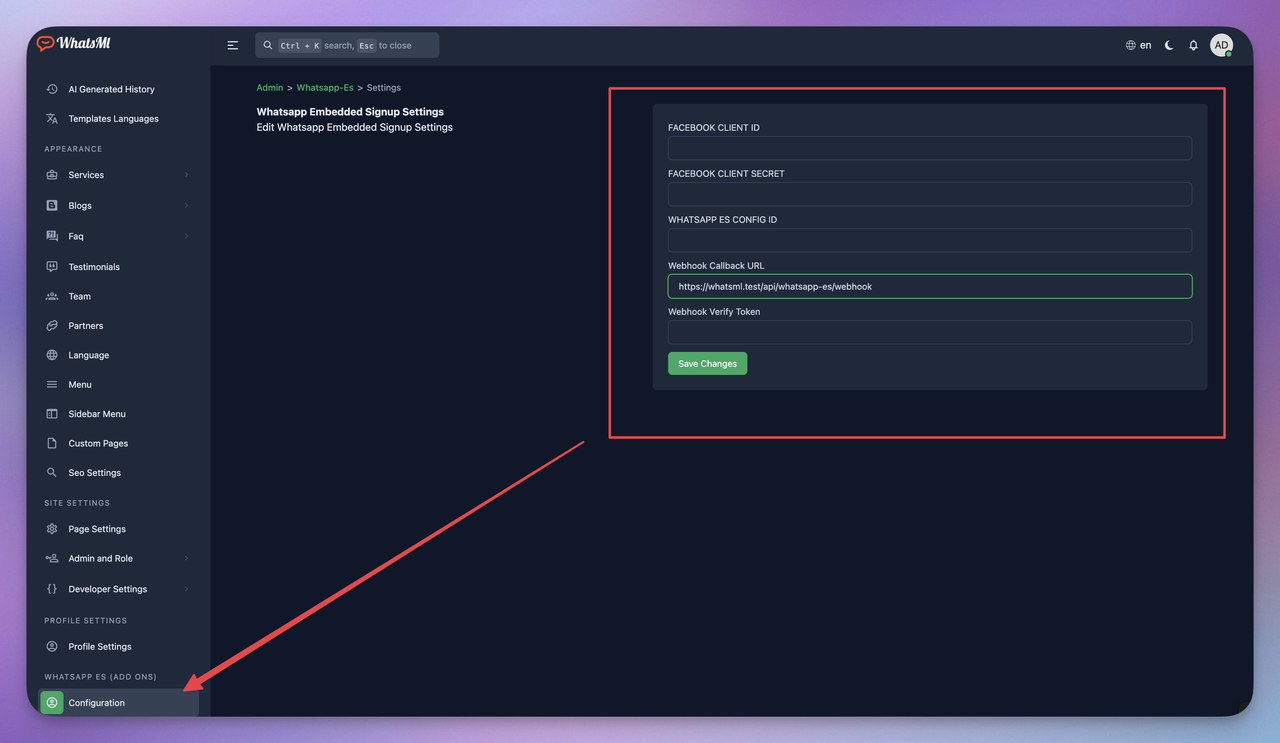 After Activate the module you can see the settings options in the side bar if you cant see that option wait 5 minutes for reseting the cache