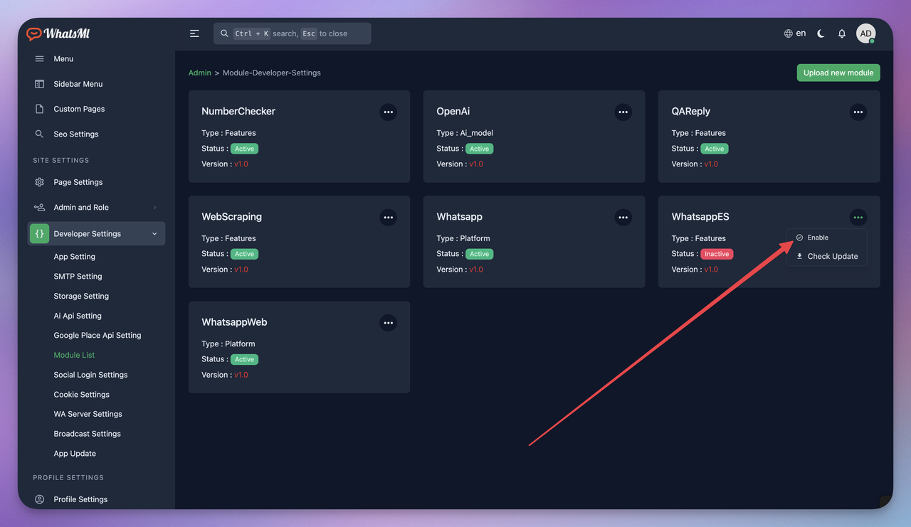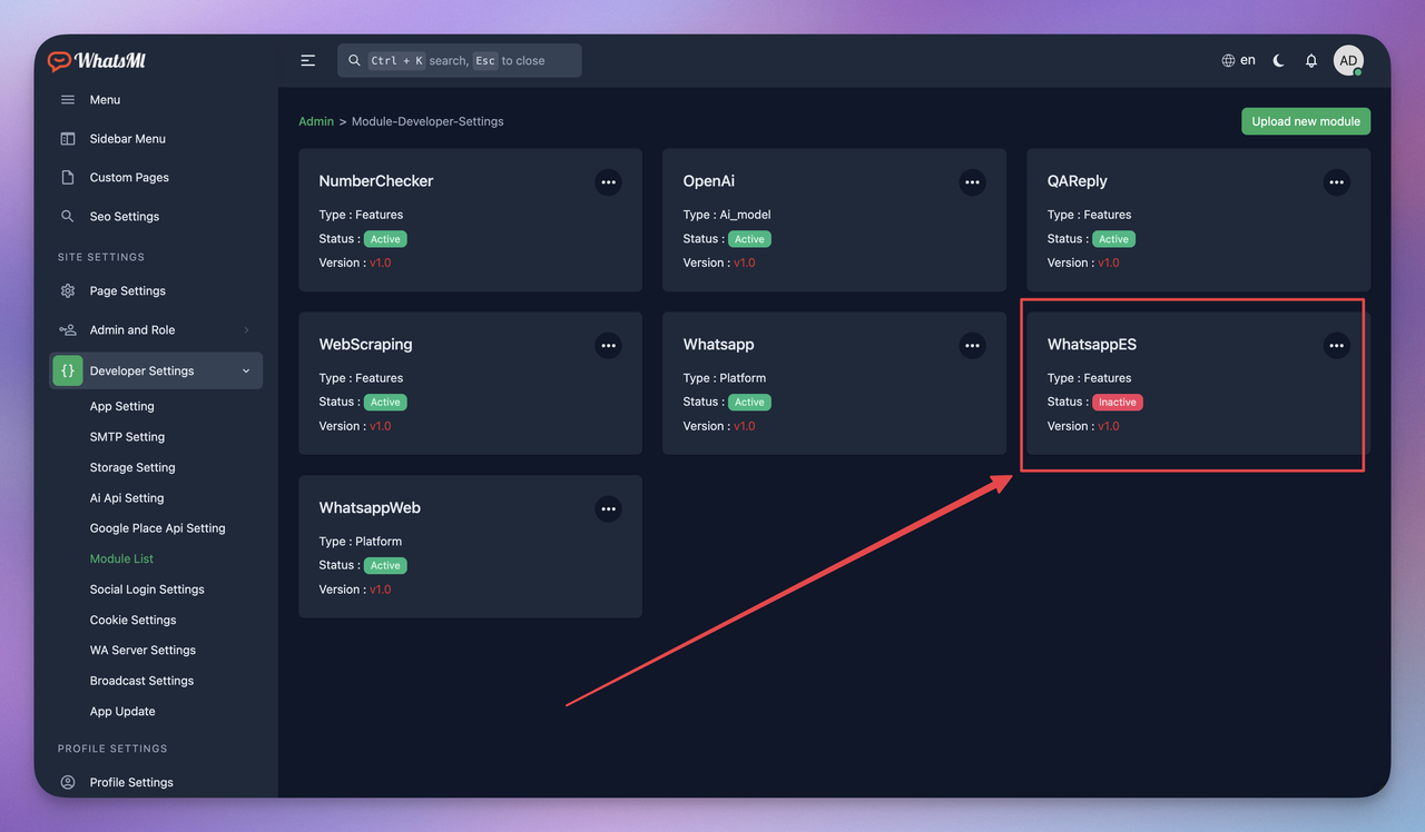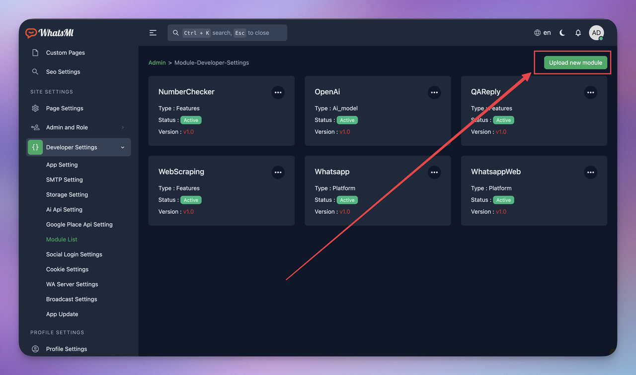 go to your socialai application -> admin end -> Developer Settings -> Module List -> Upload new module